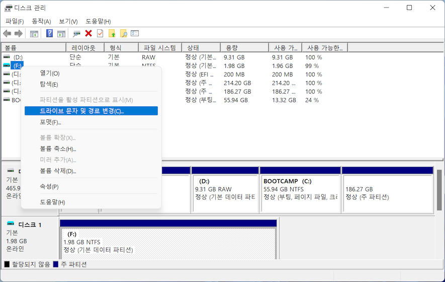 - USB 플래시 드라이브를 마우스 오른쪽 버튼으로 클릭하고 드라이브 문자 및 경로 변경을 선택합니다.